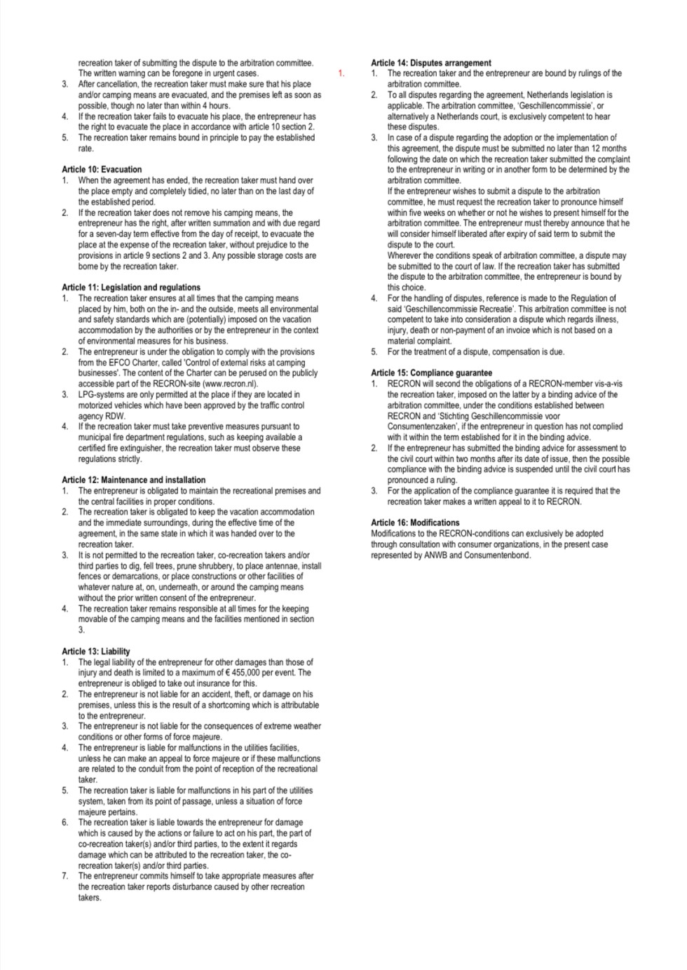 Do you have a reservation for an accommodation? Look here at the RECRON-conditions for holiday accommodation (third and forth picture).